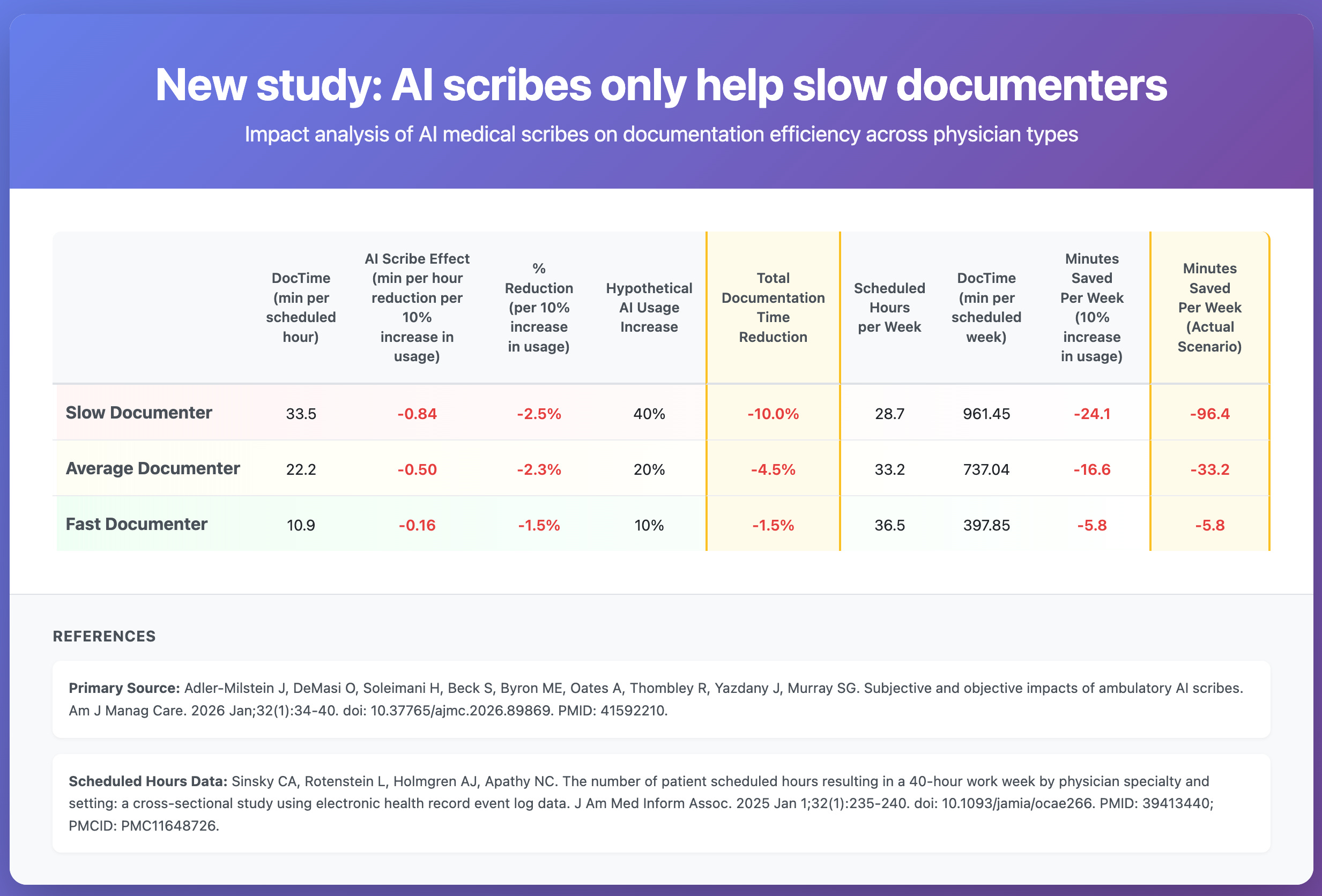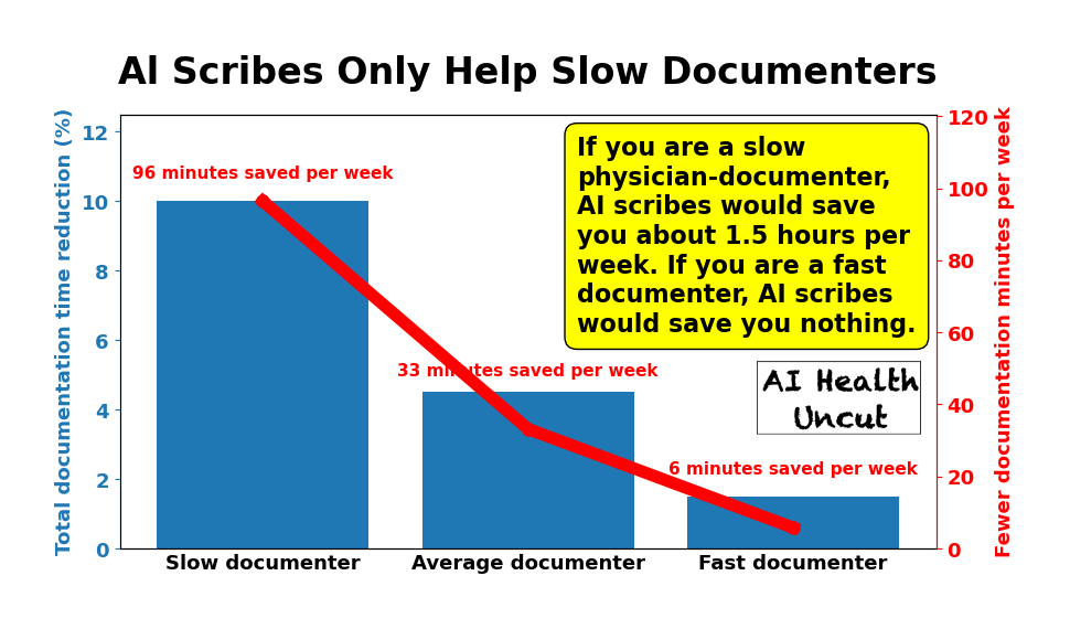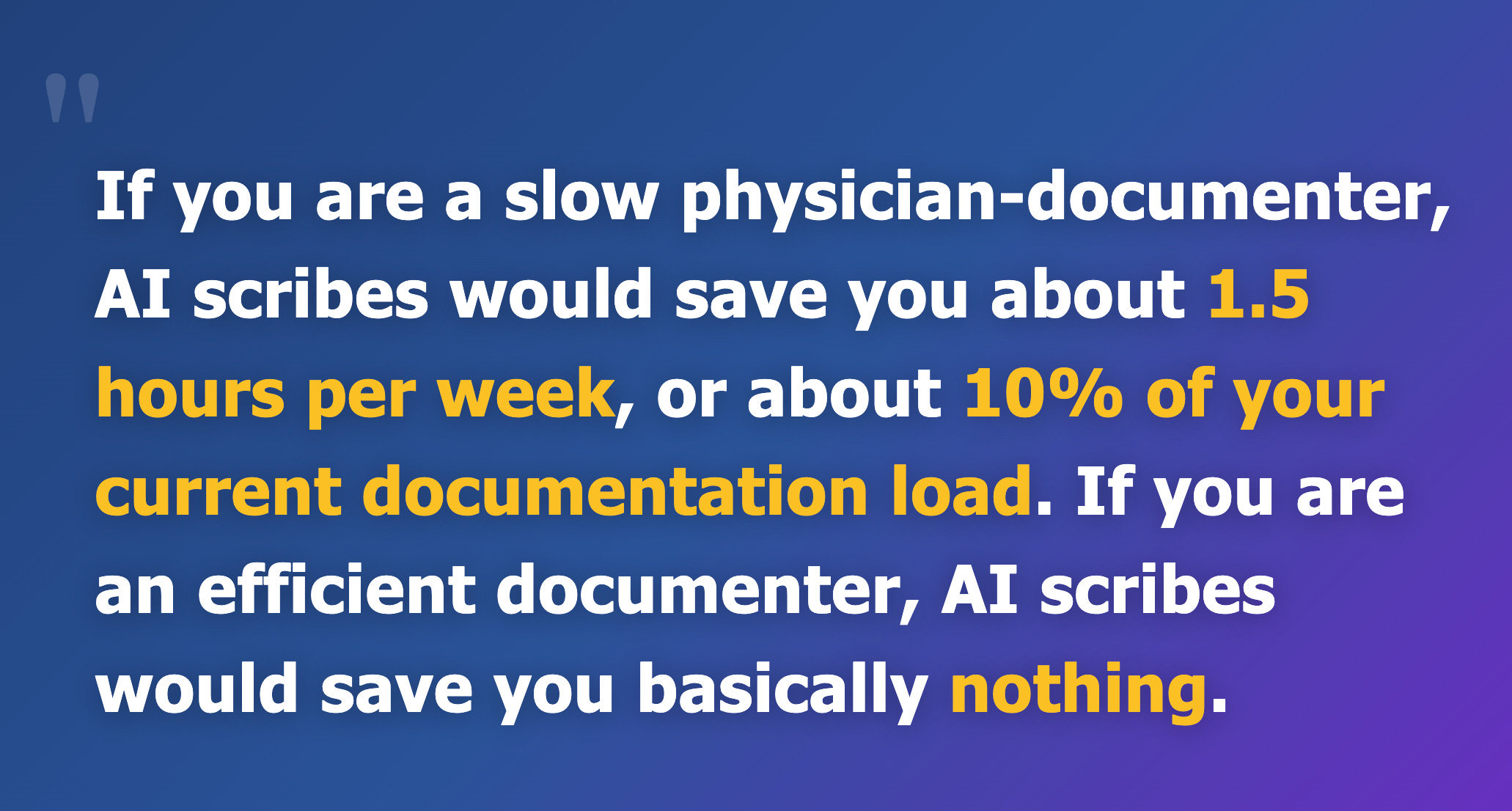 If you are a slow physician-documenter, AI scribes would save you about 1.5 hours per week, or about 10% of your current documentation load. If you are an efficient documenter, AI scribes would save you basically nothing.