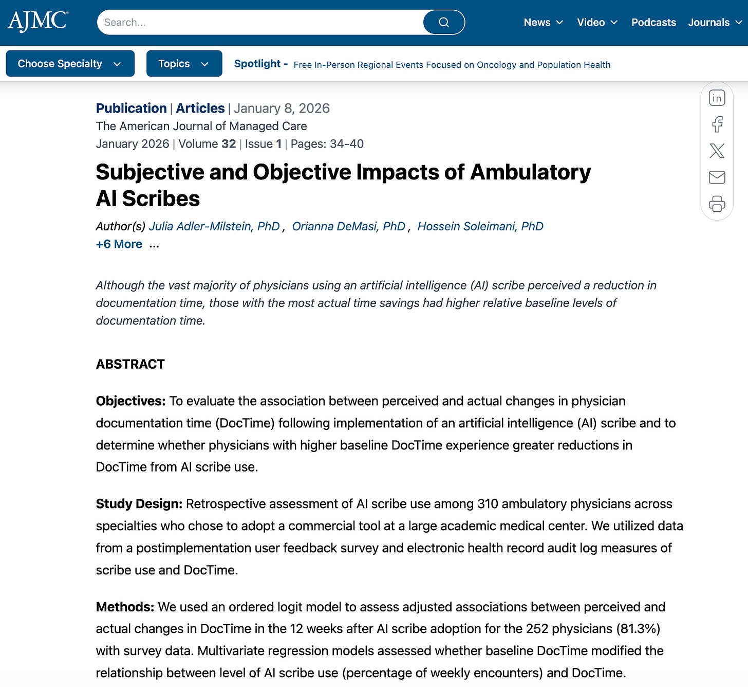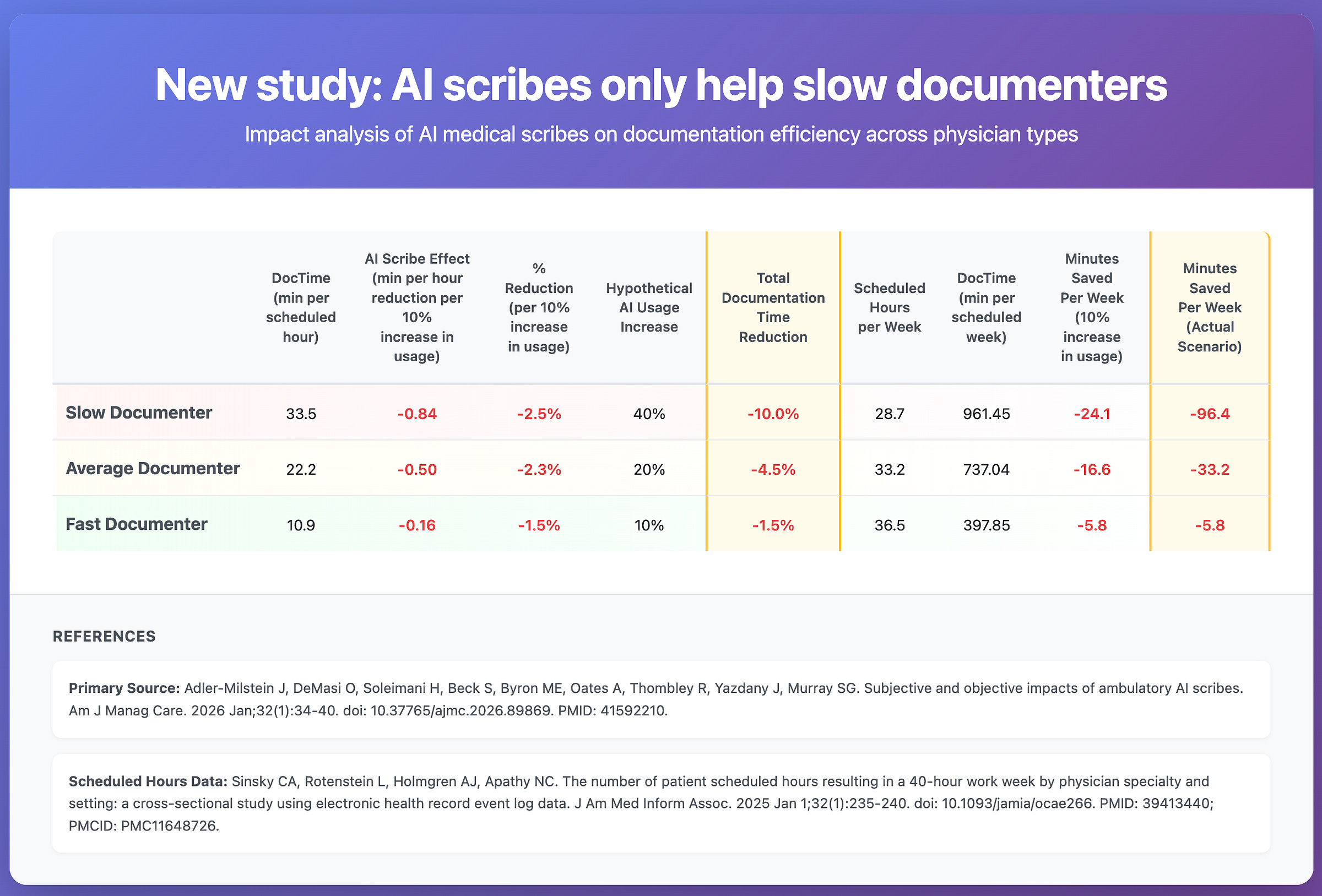 UCSF study under consideration (AJMC 2026): Significant interaction effect (P<.001) in Table 3 showing inefficient documenters realized the majority of time savings from AI scribes.
