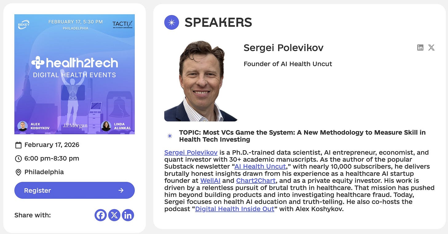 👉👉👉👉👉 Hi! My name is Sergei Polevikov. I’m an AI researcher and a healthcare AI startup founder. In my newsletter ‘AI Health Uncut,’ I combine my knowledge of AI models with my unique skills in analyzing the financial health of digital health companies. Why “Uncut”? Because I never sugarcoat or filter the hard truth. I don’t play games, I don’t work for anyone, and therefore, with your support, I produce the most original, the most unbiased, the most unapologetic research in AI, innovation, and healthcare. Thank you for your support of my work. You’re part of a vibrant community of healthcare AI enthusiasts! Your engagement matters. 🙏🙏🙏🙏🙏