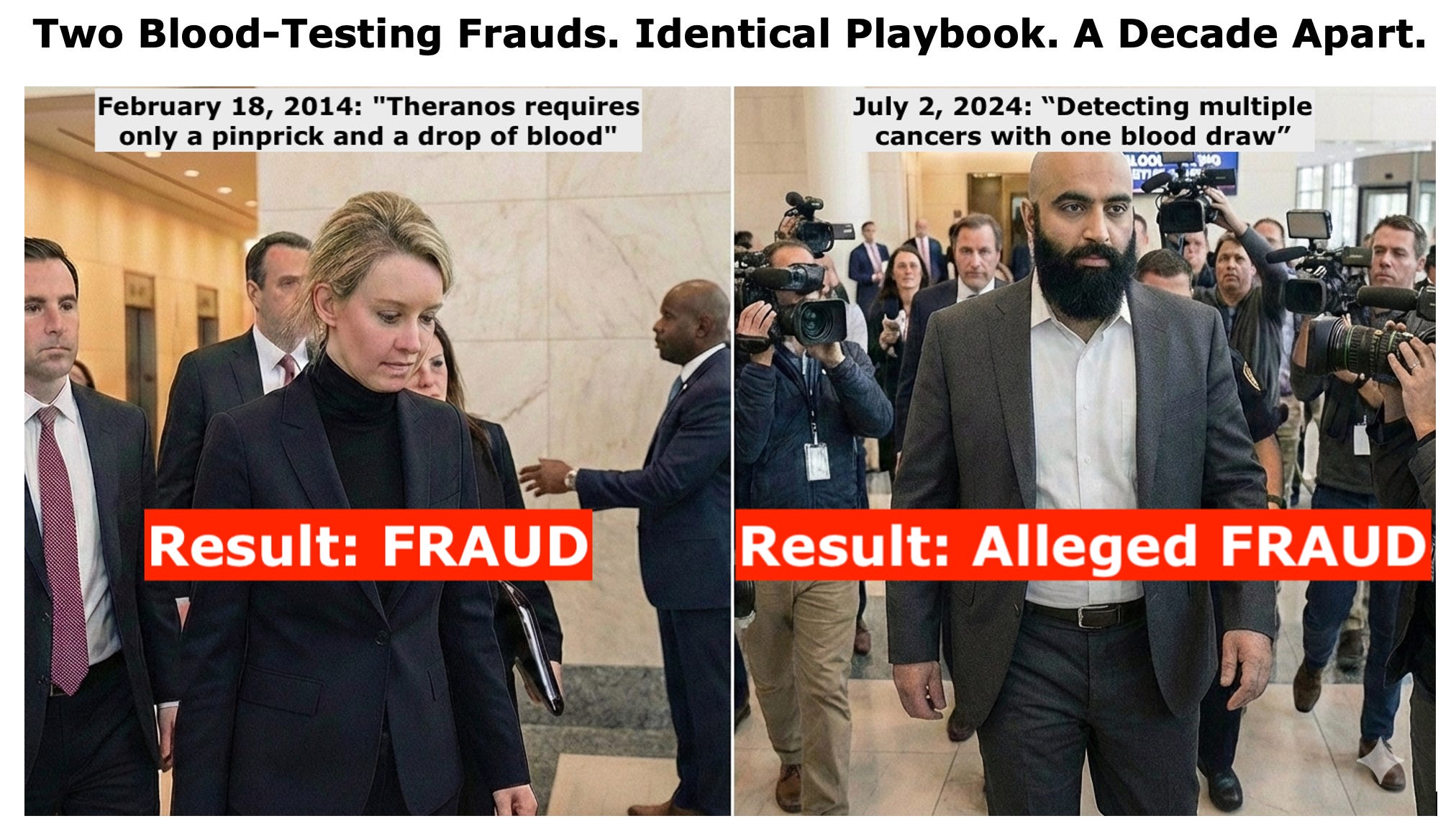 Two founders, almost exactly a decade apart, Elizabeth Holmes and Sumit Rai, faced consequences for eerily similar fraud schemes: promising “revolutionary” blood tests, exploiting regulatory gaps, and captivating investors who failed to ask basic questions. The parallels between Theranos and Cancer Check Labs are so striking that anyone who has read “Bad Blood“ (or, at a minimum, has heard Taylor Swift’s song 😉) should have seen this coming.