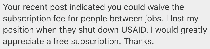 I want to highlight one recent message in particular. Someone, who is between jobs, reached out recently asking for full, paywall-free access to my Substack. Of course, I granted it, as I always do.