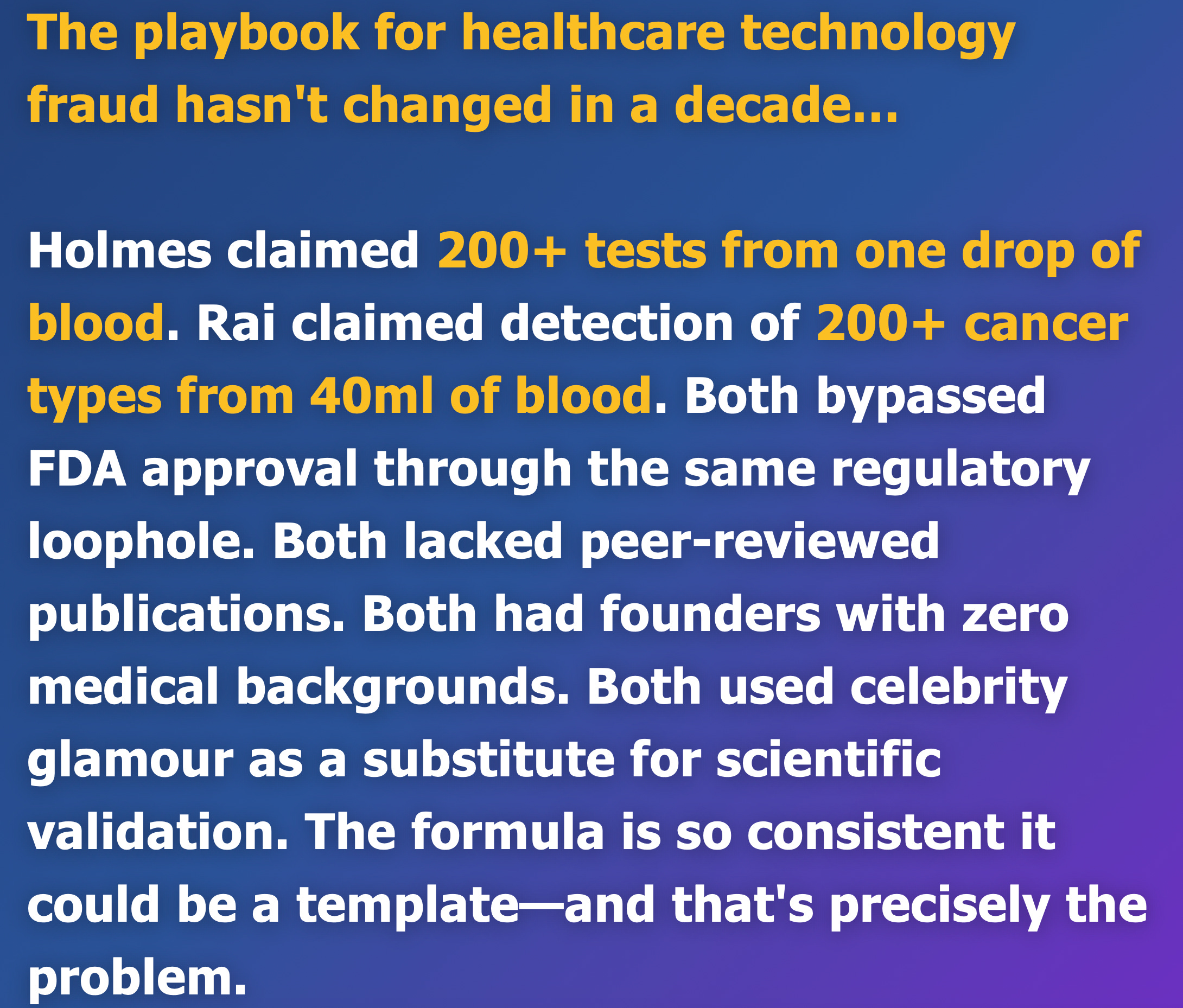 Holmes claimed 200+ tests from one drop of blood. Rai claimed detection of 200+ cancer types from 40ml of blood. Both bypassed FDA approval through the same regulatory loophole. Both lacked peer-reviewed publications. Both had founders with zero medical backgrounds. Both used celebrity glamour as a substitute for scientific validation. The formula is so consistent it could be a template—and that’s precisely the problem.