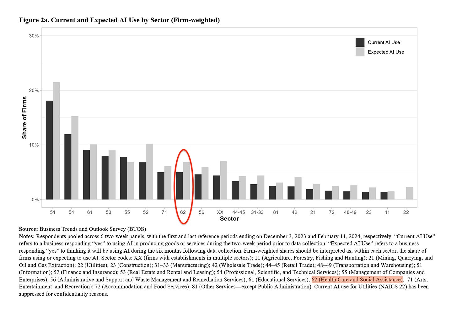 In March 2024, the U.S. Census Business Trends and Outlook Survey, or BTOS, found that about 5% of U.S. healthcare organizations were using AI, with about 7% expecting to use AI within six months. If that expectation translated into real deployments, and if adoption then climbed from about 7% by late 2024 to about 10% now, that is how I get to current AI usage in healthcare today. By the way, in BTOS terms, “healthcare organizations” are defined by the NAICS sector “Health Care and Social Assistance” (NAICS 62).
