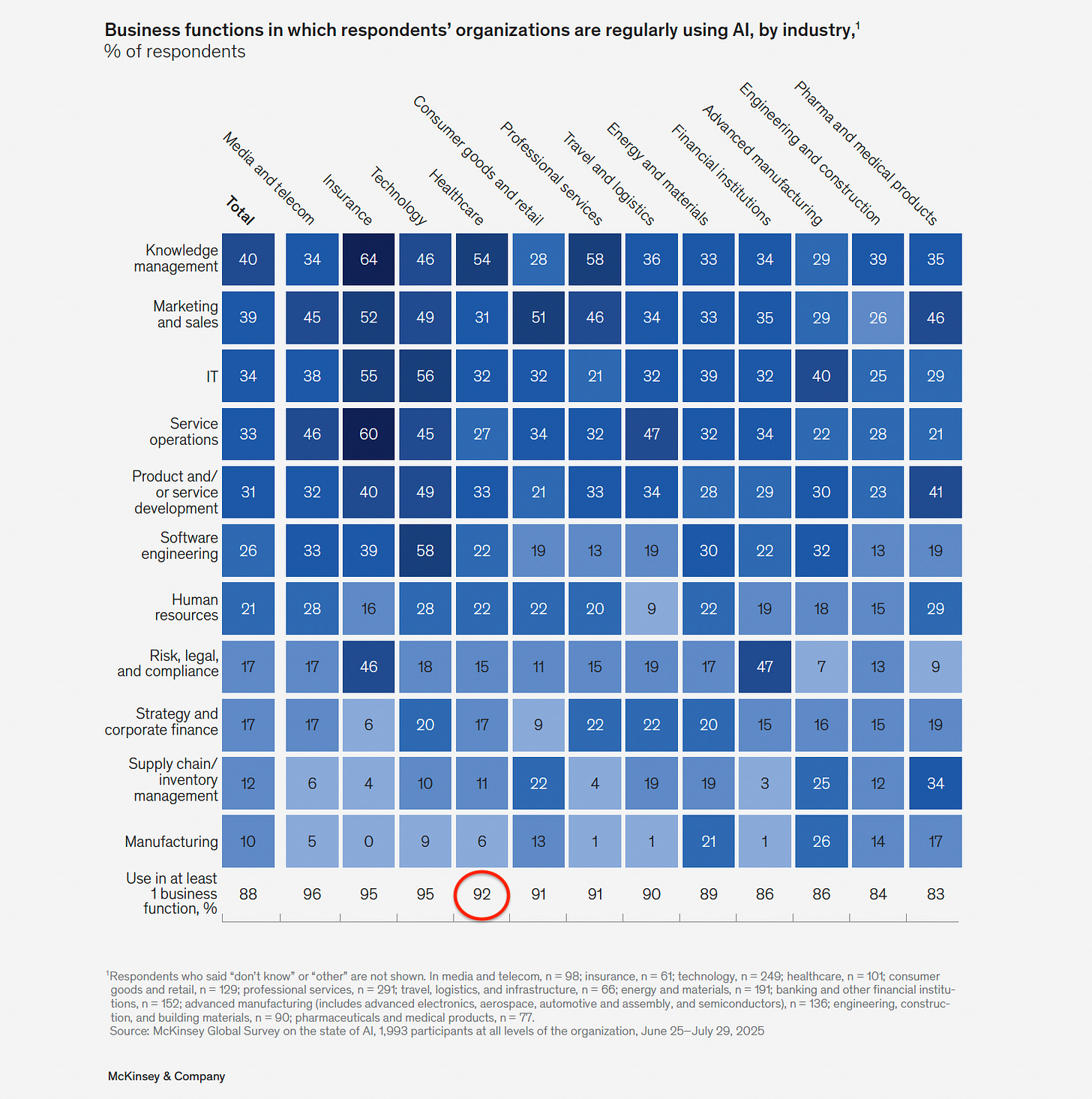 McKinsey’s new “The state of AI in 2025: Agents, innovation, and transformation” report is out, and everyone seems to be clinging to the “92% AI adoption” number. Again. 🙄